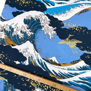 Welle vor Kanagawa Goldmetallic, Baumwollstoff Cosmo Japan, Blau