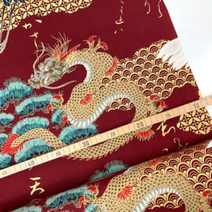 Kraniche Drachen Goldmetallic, Baumwollstoff Cosmo Japan, Dunkelrot