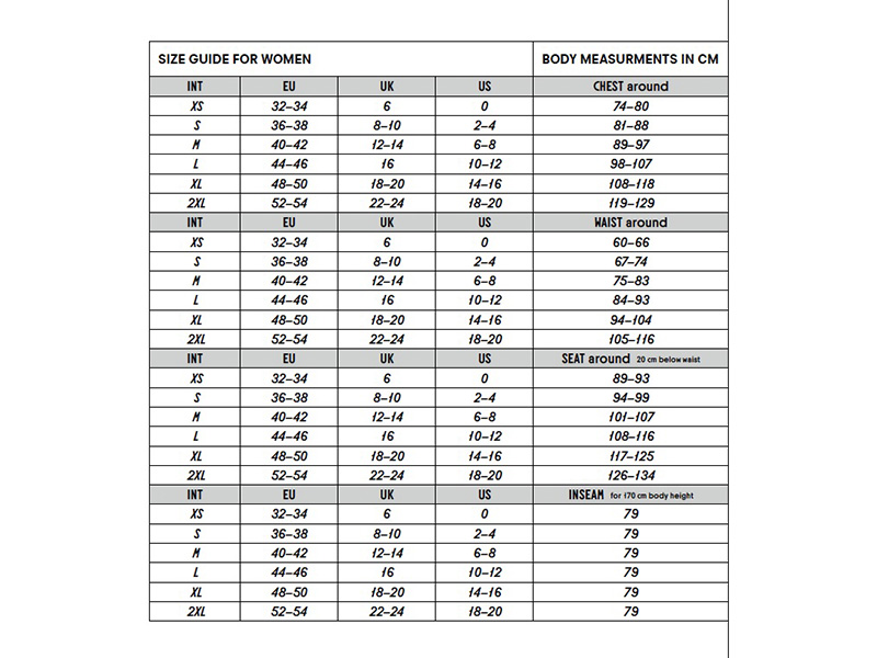 - Women sizes XS – 2XL, see size guide image
