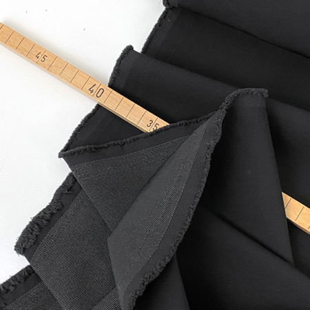 Baumwolltwill mit schöner Webstruktur und einem gewissen Volumen. Der Stoff besitzt eine schöne Materialstärke, ist aber gleichzeitig nicht zu fest gewebt, so dass er trotz Stand einen schönen Fall besitzt. Die Oberfläche ist matt, der Stoff hat einen sehr schönen Griff und eine tolle Farbe durch die Vergebung mit schwarz.