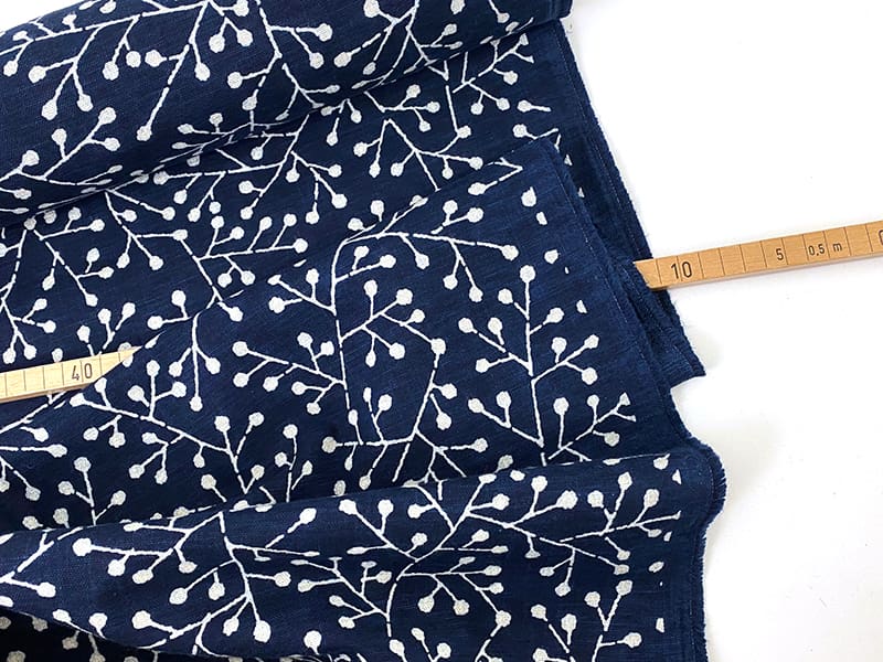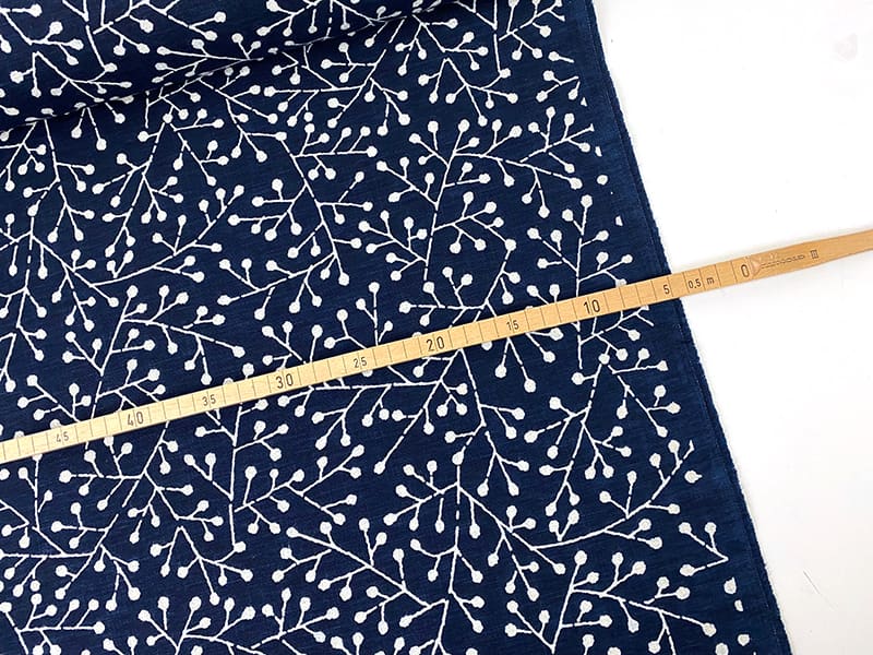 Diese handbedruckten Baumwollstoffe aus Japan erzählen eine Geschichte! Man spürt die Handarbeit und Sorgfalt, mit denen sie hergestellt werden. Ein Charme, der sich sofort überträgt, ohne dass man sagen könnte, woran es genau liegt, es ist ein Zusammenspiel des tollen Materials, der intensiven Farbe und des markanten Musters. Der Stoff ist locker mit schöner Webstruktur gewebt, es handelt sich um ein wunderschönes Indigoblau und ein lebendiges Muster mit grafischen Zweigen.