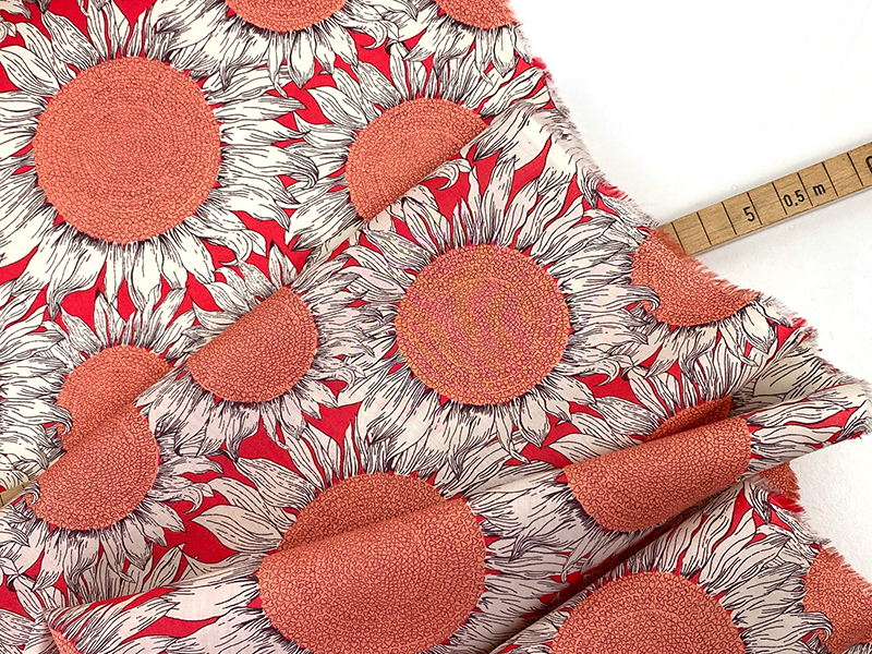 Zarter Baumwollbatist in einzigartiger Qualität mit einem markanten Muster großer Sonnenblumen auf rotem Grund. Die Blüten sind detailliert und lebendig gezeichnet, dadurch ergibt sich eine wunderschöne Sommerwiese.