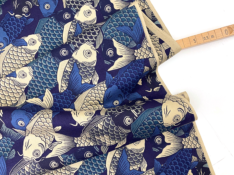 Der Koi (Karpfen) hat in Japan eine besondere Bedeutung. Er steht für Wohlstand, Kraft, und ein langes Leben. Daher ist er als Motiv sehr beliebt. In diesem Stoffdesign tummeln sich unzählige Kois in einer sehr schönen Farbstellung aus dunklen Blautönen auf sandfarbenem Hintergrund.
