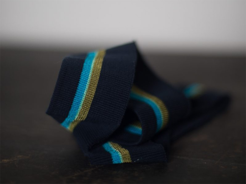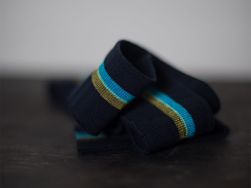 Sehr schönes Streifenbündchen in Dunkelblau mit Streifen in Türkis, Olivengrün und einem feinen Akzent in Pistazie.