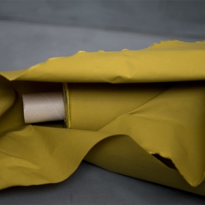 Wasserabweisender Bio Baumwollcanvas in einem dunklen Goldgelb (Karamell) mit edler, matter Oberfläche. Beim Dry Oilskin wurde überschüssiges Öl nach der Beschichtung wieder abgetragen, so dass das Material einen trockenen Touch besitzt und auch keinerlei Rückstände auf anderen Stoffen/Kleidungsstücken hinterlässt. Er ist unkompliziert und angenehm zu verarbeiten, lässt sich sehr präzise zuschneiden und mit Universalnadeln vernähen.