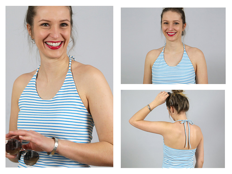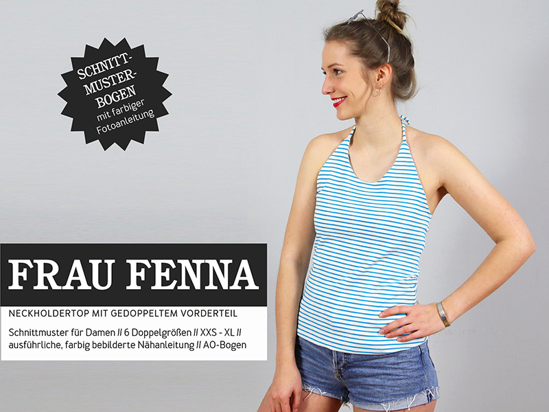 FRAU FENNA ist ein zeitloses, figurbetontes Neckholdertop. Ideal für heiße Sommertage am Strand oder coole Partynächte. Das gedoppelte Vorderteil kannst Du wahlweise mit zwei unterschiedlichen Ausschnittkanten nähen. FRAU FENNA wird Dein Sommerliebling, denn das Top ist blitzschnell genäht!