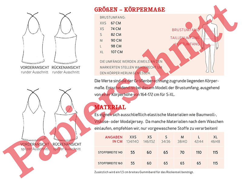 - Materialempfehlung: ausschließlich elastische Materialien wie Baumwoll- oder Stretchjerseys, Viskose- oder Modaljersey oder leichter Strick.