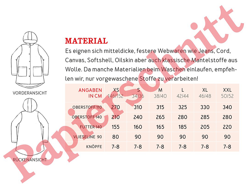 • Materialempfehlung: mitteldicke, festere Webwaren wie Jeans, Cord, Canvas, Softshell, Oilskin aber auch klassische Mantelstoffe aus Wolle