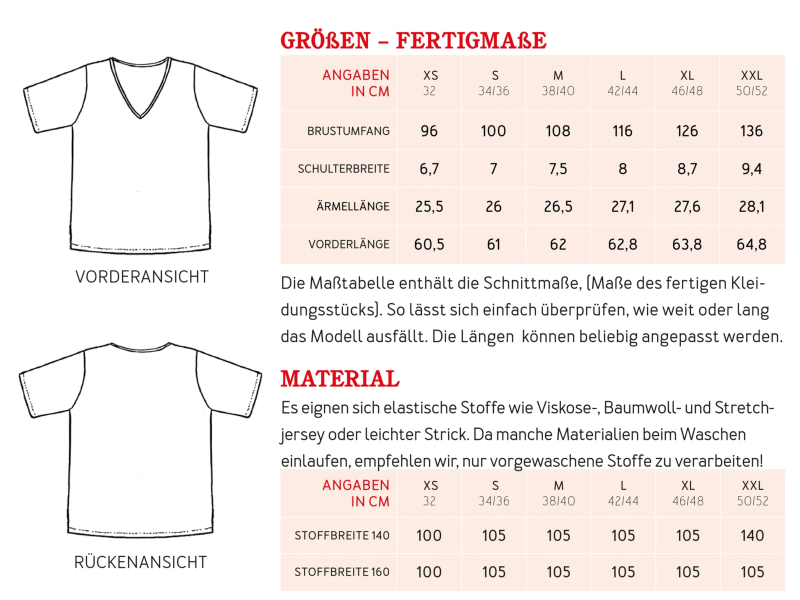 • Materialempfehlung: elastische Stoffe wie Viskose-, Baumwoll- und Stretchjersey oder leichter Strick.