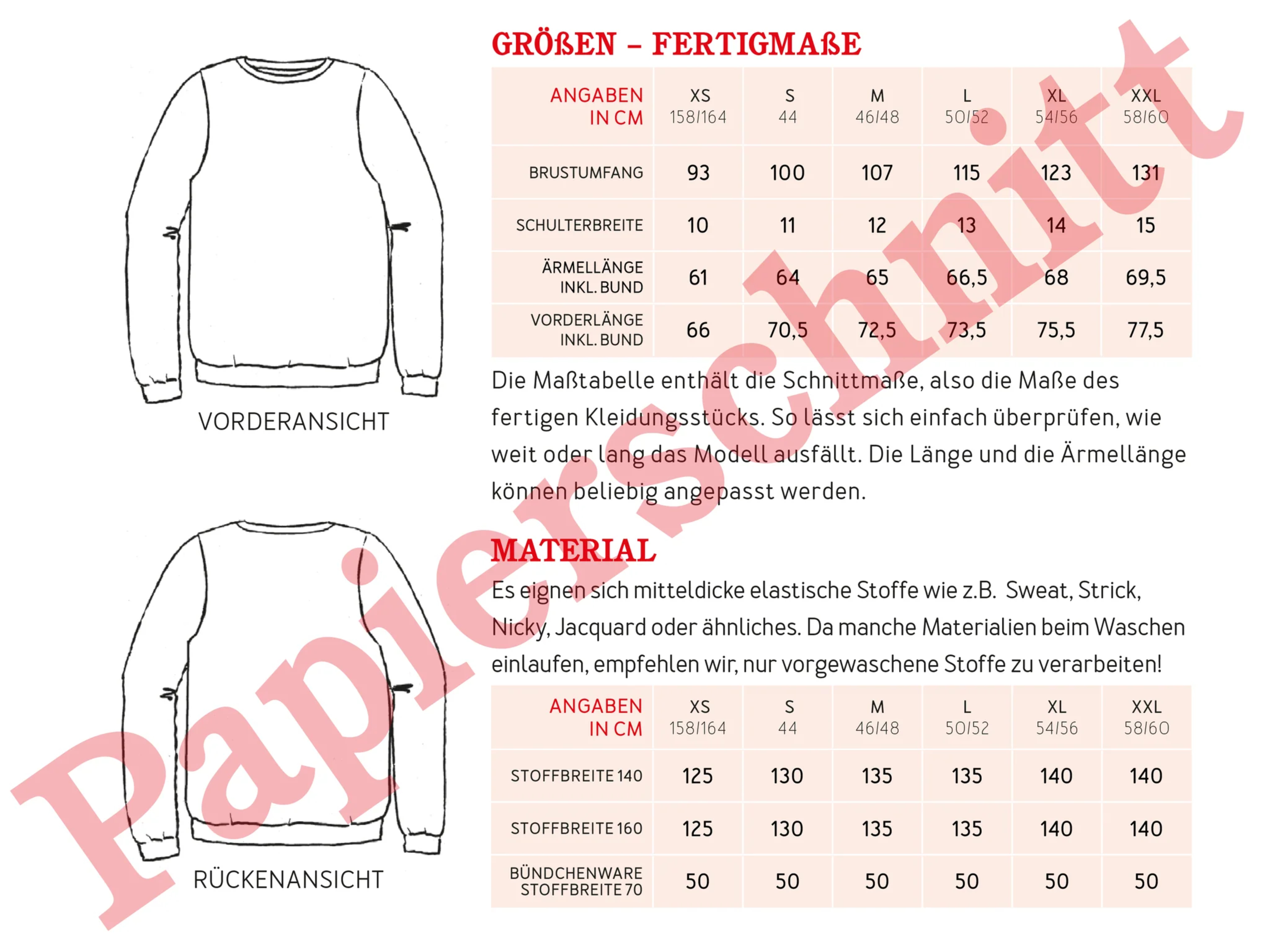 Papierschnittmuster in 6 Doppelgrößen XS (158/164) bis XXL (58/60)
