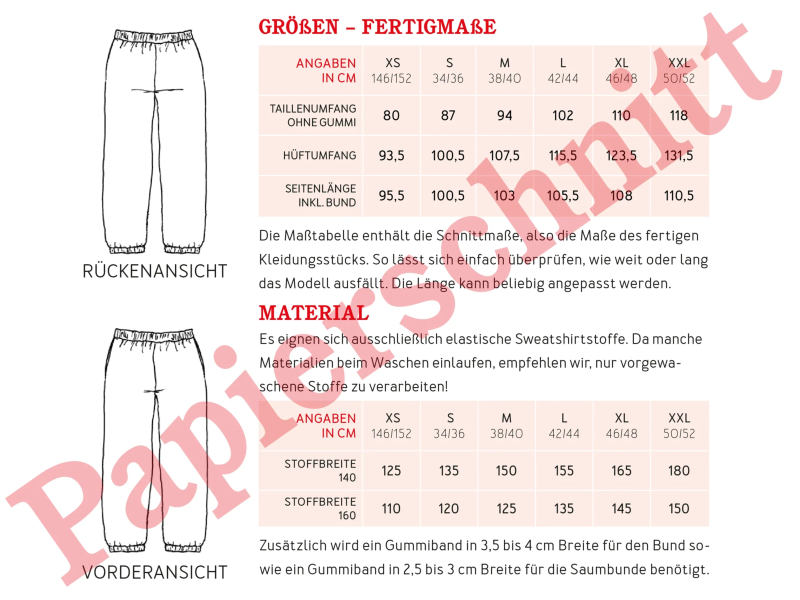 • Zusätzlich wird ein Gummiband in 3,5 bis 4 cm Breite für den Bund sowie ein Gummiband in 2,5 bis 3 cm Breite für die Saumbunde benötigt.