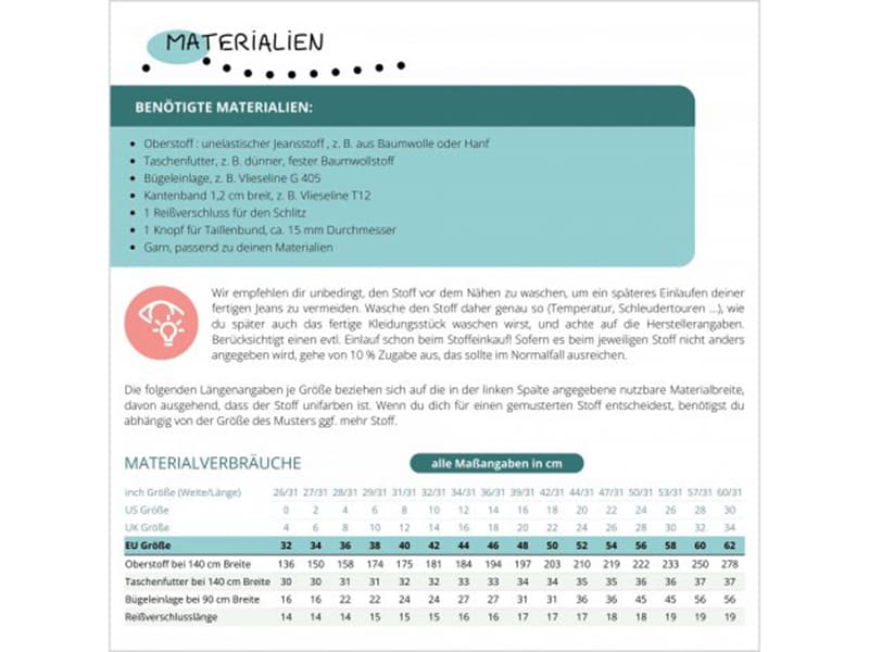 Das Schnittmuster ist ein Mehrgrößenschnitt und enthält die Konfektionsgrößen 32 – 62.