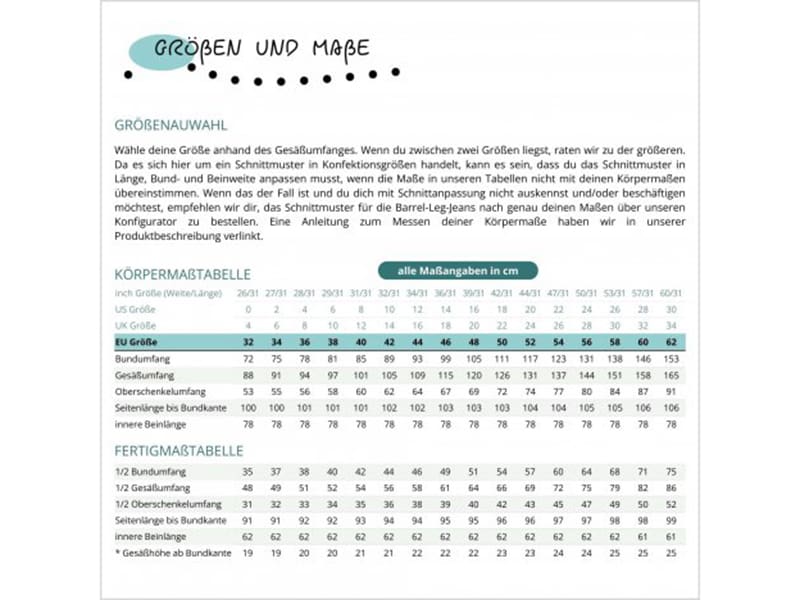 - EU- Größen 32 bis 62 (dies entspricht den für Jeans typischen Inch-Größen 26/31 bis 60/31).