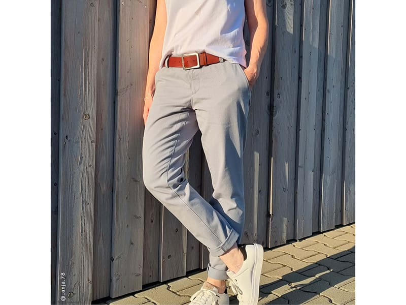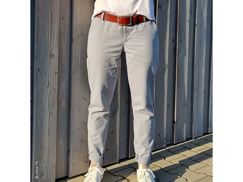Die Frauen-Chino HC02 ist klassisch geschnitten, hat eine mittlere Bundhöhe und normale Schritttiefe. Vorne gibt es schräge “französische” Taschen und hinten klassische Paspeltaschen mit 12 mm breiten Paspeln. Der 4 cm hohe Formbund sorgt für guten Sitz und optimalen Halt. Der vordere Schlitz wird mit einem Reißverschluss gearbeitet.