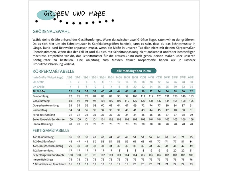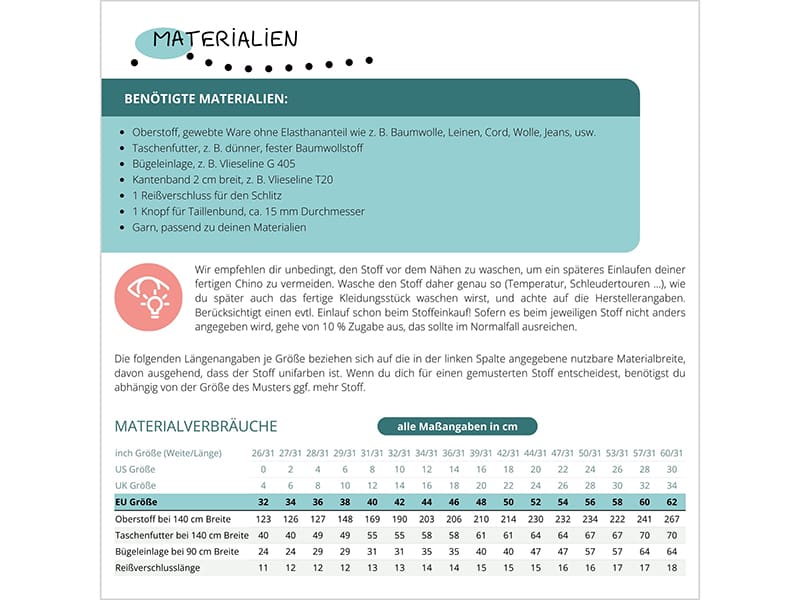Das Schnittmuster ist ein Mehrgrößenschnitt und enthält die Konfektionsgrößen 32 – 62.