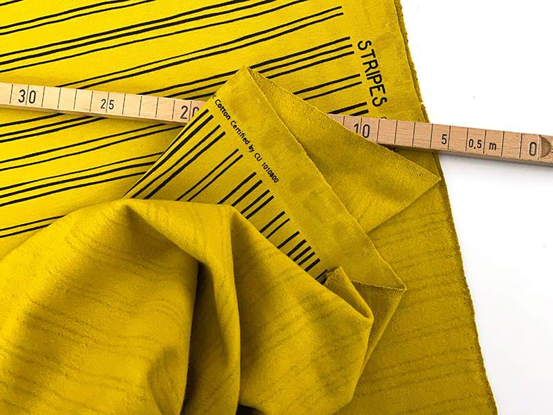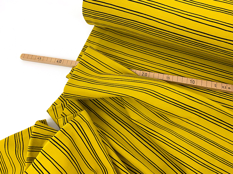 So kuscheliger Bio Baumwollsweat in ockergelb mit grafischen Linien. Der Stoff ist durchgefärbt. also auch von hinten ockergelb. Die Innenseite ist angeraut und superweich.