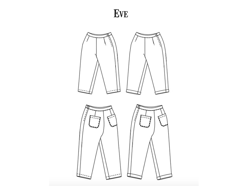 „The Eve Trousers“ ist ein Schnittmuster für ein schlichte 7/8 Hose mit einem optionalen Umschlag am Bein. Sie hat 2 Taschen und wird mit einem seitlichen Reißverschluss geschlossen. Eve hat eine sehr schöne Passform durch die Abnäher bzw. Falten in der Taille.