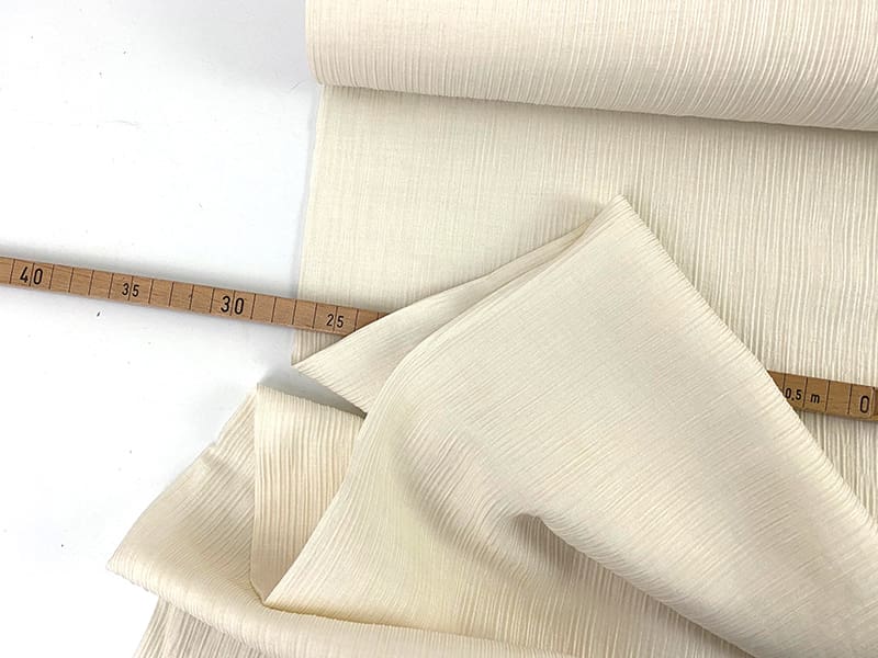 Weich fließender Webstoff aus Tencel mit Wollanteil in leicht getöntem Weiß. Er hat Substanz und durch den hohen Tencelanteil einen sehr schönen Drape. Die kreppartige Oberfläche macht den Stoff sehr lebendig, schick und knitterarm.
